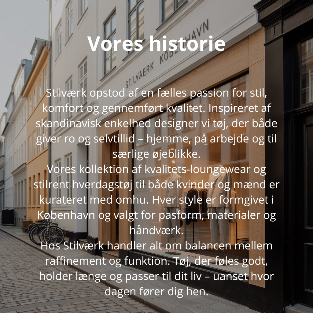 Hos Stilværk handler alt om håndværk. Vi skaber tidløst, elegant tøj i materialer af højeste kvalitet – nøje udvalgt for stil, bæredygtighed og komfort. For os er kvalitet ikke et tilvalg; det er fundamentet for alt, hvad vi gør.